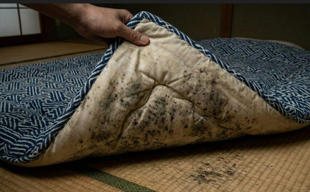 正直に言いますが、布団を敷きっぱなしにする「万年床」は絶対にNGです。人が寝ている間にかいた汗は布団を通り抜け、畳の表面に蓄積されます。布団が敷かれたままだと湿気の逃げ場がなくなり、畳と布団の境目は湿度80%以上の「蒸し風呂」状態になります。これはカビやダニにとって最高の繁殖環境です。因みに私も以前万年床にしてたことがありましたが、4~5日位万年床をしてたら速攻で畳や布団黒カビだらけになりました。更に私が現場で見た最悪のケースでは、畳の改修のために布団を上げたら、布団の形にクッキリと黒カビが生え、畳床まで腐っていた…なんてこともありました。こうならないための鉄則はシンプルです。