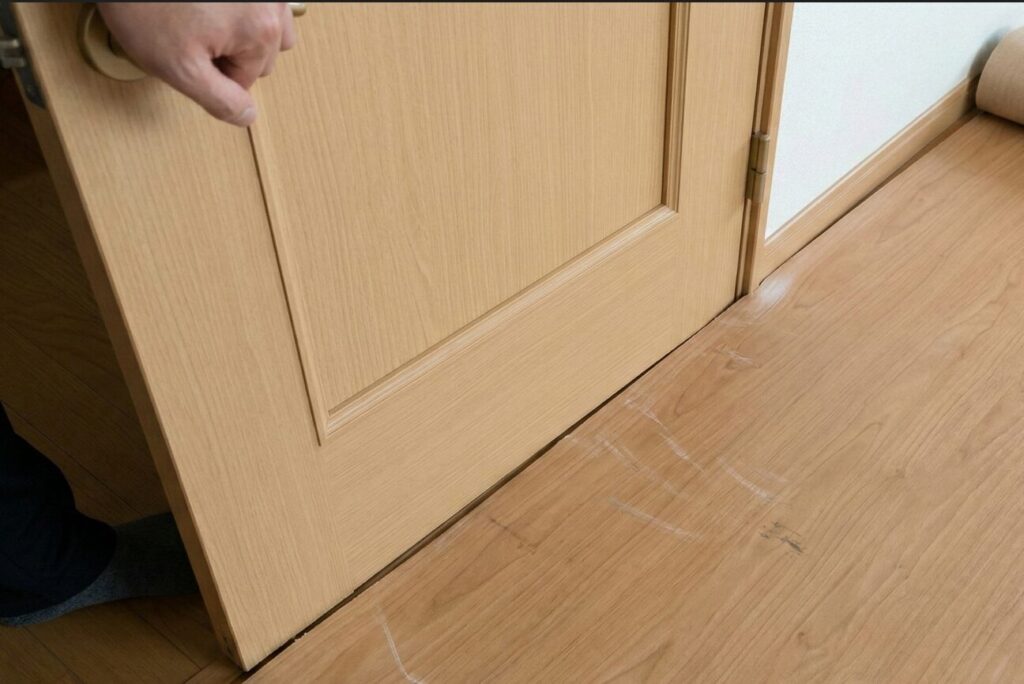 「ちょっと擦ってるけど、力づくで開ければいいや」は絶対にNGです。ドアの軸が歪んで壊れたり、せっかくの新品ウッドカーペットに円状の深い傷がついたりします。違和感を感じたらすぐに対策しましょう。