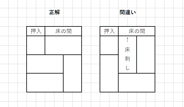 床の間がある立派な和室をお持ちの家では、「床刺し(とこざし)」に気をつけなければなりません。床刺しとは、床の間に対して、畳の縁(へり)が垂直に向かって伸びている敷き方のことです。まるで畳が床の間に向かって突き刺さっていくように見える配置です。