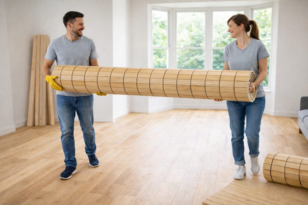 本間6畳のウッドカーペットを購入する際、最大の落とし穴となるのが「重さと大きさ」です。ここを甘く見ていると、商品が届いたのに玄関まで運べない、という最悪の事態になりかねません。本間6畳のサイズ(約286cm×382cm)を1枚のカーペットとして丸めた場合、その梱包サイズは長さ約290cm、直径約20cm〜25cmにもなります。重量も30kg〜45kgに達し、大人二人でも持ち上げるのがやっとです。